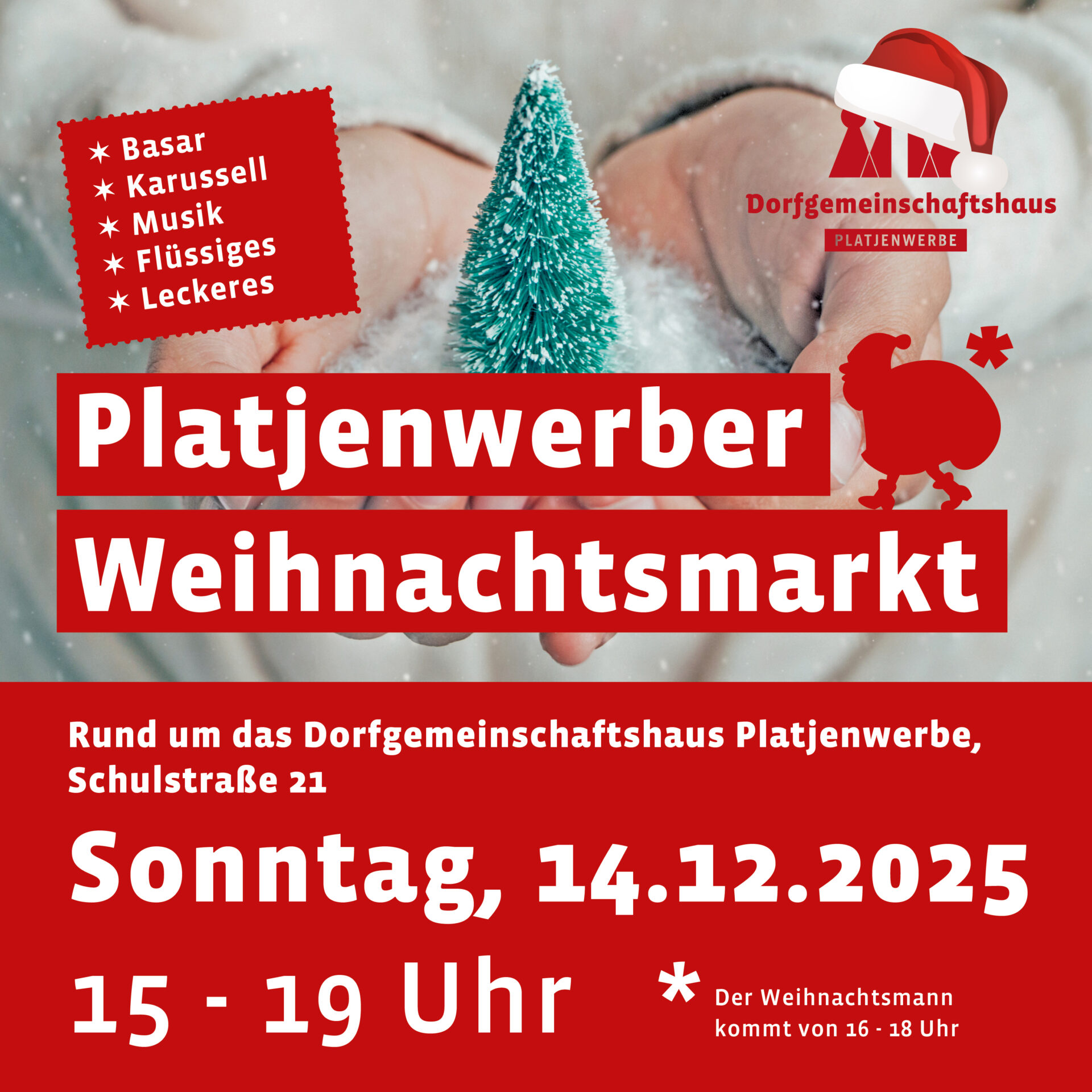 Weiterlesen: Platjenwerber Weihnachtsmarkt 2025Liebe Platjenwerber,🎄Am 14.12. findet unser Weihnachtsmarkt rund um das Dorfgemeinschaftshaus wieder statt.🎄Für einige Aufgaben benötigen wir noch helfende Hände!Bitte tragt euch gerne, bei Interesse, für …