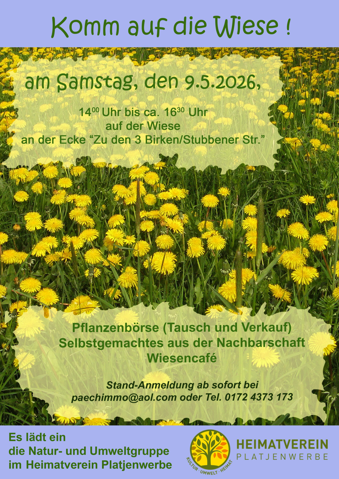 Weiterlesen: „Komm auf die Wiese!“ – Frühlingsfest mit Natur- und Umweltgruppe des Heimatvereins PlatjenwerbeAm Samstag, den 9. Mai 2026, lädt die Natur- und Umweltgruppe des Heimatvereins Platjenwerbe herzlich zum Frühlingsfest „Komm auf die Wiese!“ ein. Von 14:00 bis …